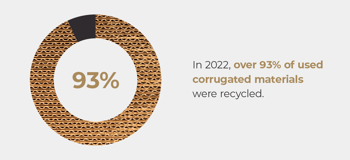 Businesses can customize corrugated boxes to reduce waste, and this packaging is stackable to use less storage space. It also decreases the amount of material required by making it collapsible, reusable, and recyclable for multiple purposes. In 2022, over 93% of used corrugated materials were recycled.