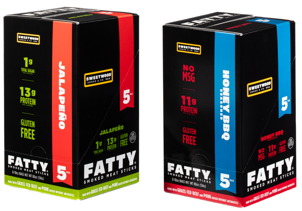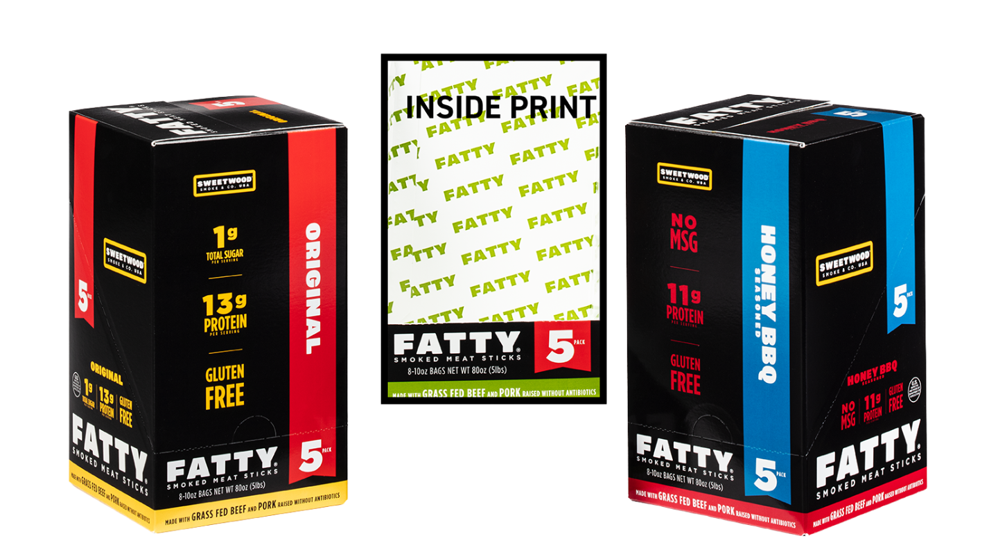 Sweetwood Smoke & Co., maker of FATTY Smoked Meat Sticks, needed a shelf-ready package with an opening feature that would tear off cleanly and easily. They also needed to manage multiple SKUs with color consistency and wanted to have their branding printed on the inside of the package. Finally, they requested the packages to be strong enough to withstand the supply chain and retail environment.